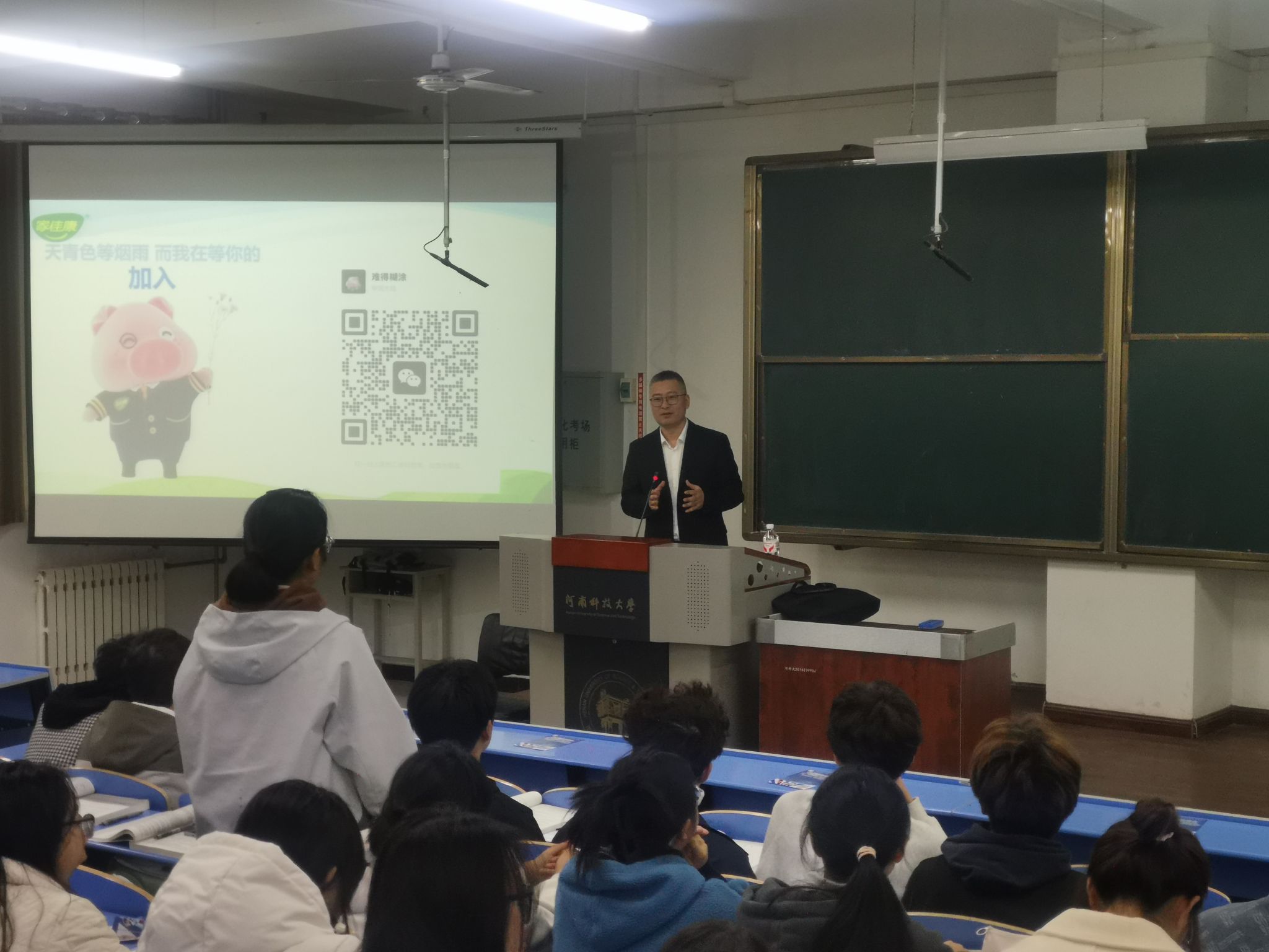 11 月 4 日,我院邀请中粮家佳康有限公司养殖饲料部总经理张建走进2025级动物医学专业导论课堂,给104名大一新生做了一场面对面的专业指导。课堂上,张建总经理系统梳理了养猪业从传统模式到现代规模化、智能化和可持续化发展的演进历程,剖析了当前在畜禽健康保障、绿色养殖技术等方面的核心需求,并指出动物医学专业在推动畜牧产业高质量发展、保障食品安全中的关键作用,为新生明晰专业价值提供了行业视角。同学们纷纷表示,将以更明确的目标投入后续专业学习,为投身畜牧兽医行业扬帆起航。
