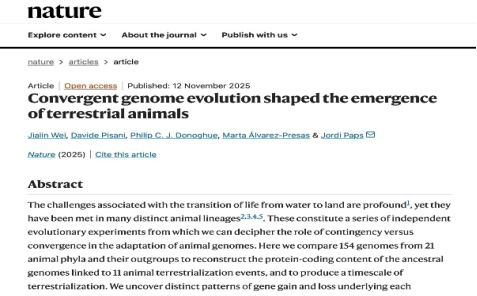 近日,我院校友魏家琳以独立第一作者身份在国际顶级期刊《Nature》(2024年影响因子48.5)发表题目为《Convergent genome evolution shaped the emergence of terrestrial animals》的学术论文。该研究基于150余种动物基因组,重建了11次动物独立“登陆”事件的祖先基因组,发现基因获得与丢失在水陆转变过程中普遍发生,揭示基因组可塑性在动物陆生化中的关键作用,为理解动物适应陆地环境的演化机制提供了重要证据。