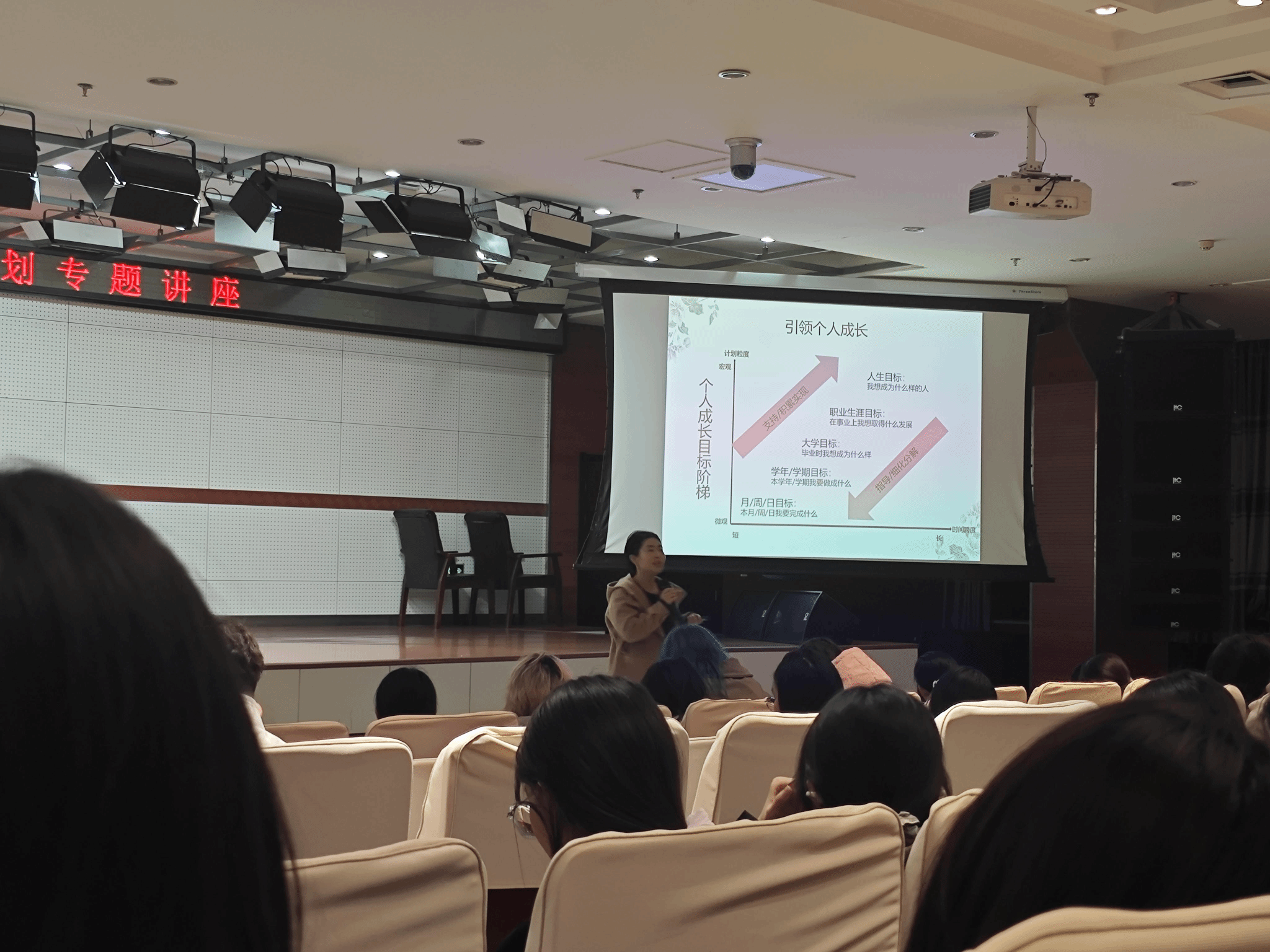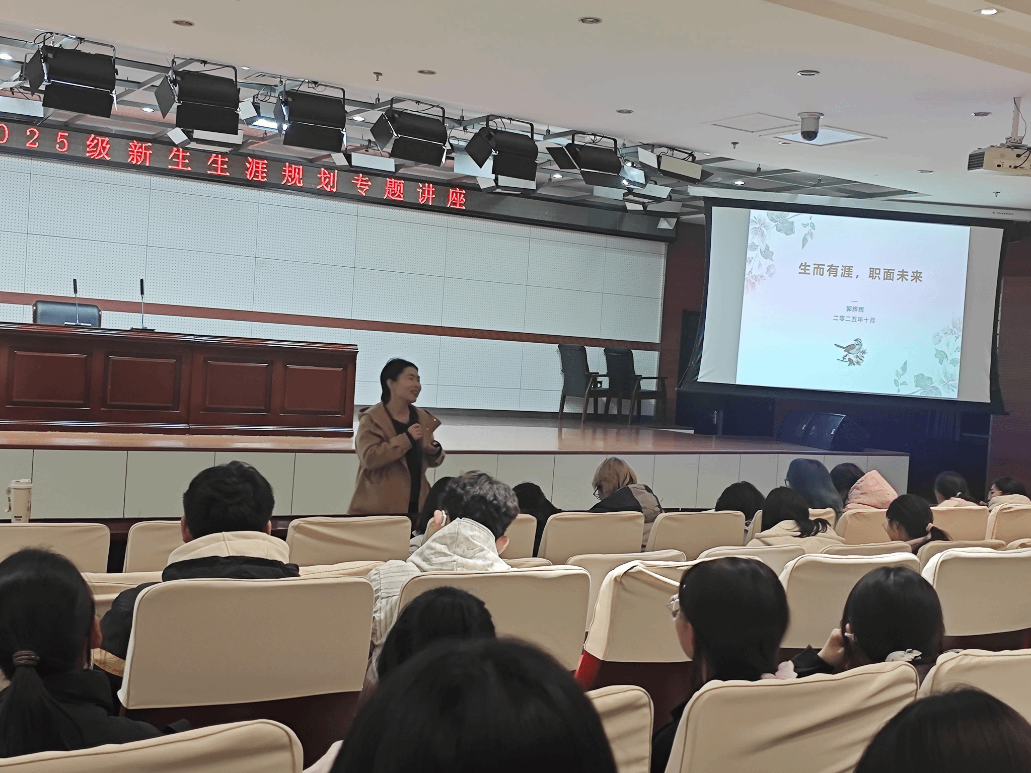 郭老师以大学规划为切入点,强调其是引领青春的“指南针”。她围绕“认知自我、探索专业、规划行动”三个维度,指导同学们结合兴趣与行业需求,科学规划大学生活。互动环节,同学们踊跃分享职业构想,并就“好工作”的定义展开讨论。郭老师总结指出,“热爱、适配、成长”是职业选择的关键。